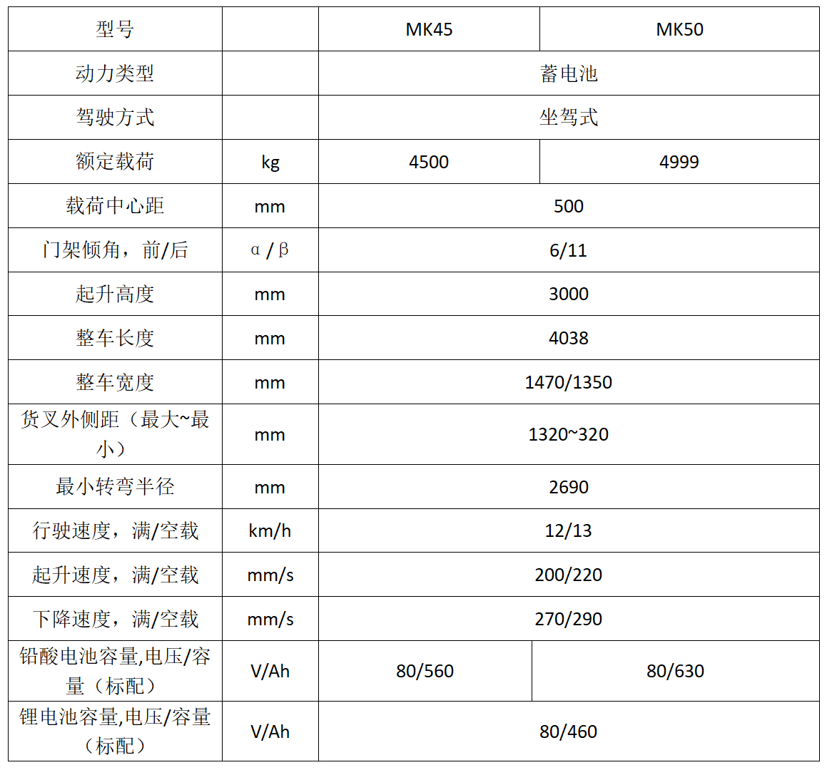 新型MK系列高性能蓄电池平衡重式叉车,涵4.5/5.0两种吨位。采用单驱机械差速桥式设计,免维护全交流配置,大速比齿轮箱为更大的爬坡和脱困提供了保证,主要满足客户效率优先的需求,中重型工况,追求高起升速度,高行驶速度,大容量蓄电池,优良的人机工程以及易操作性、安全性。