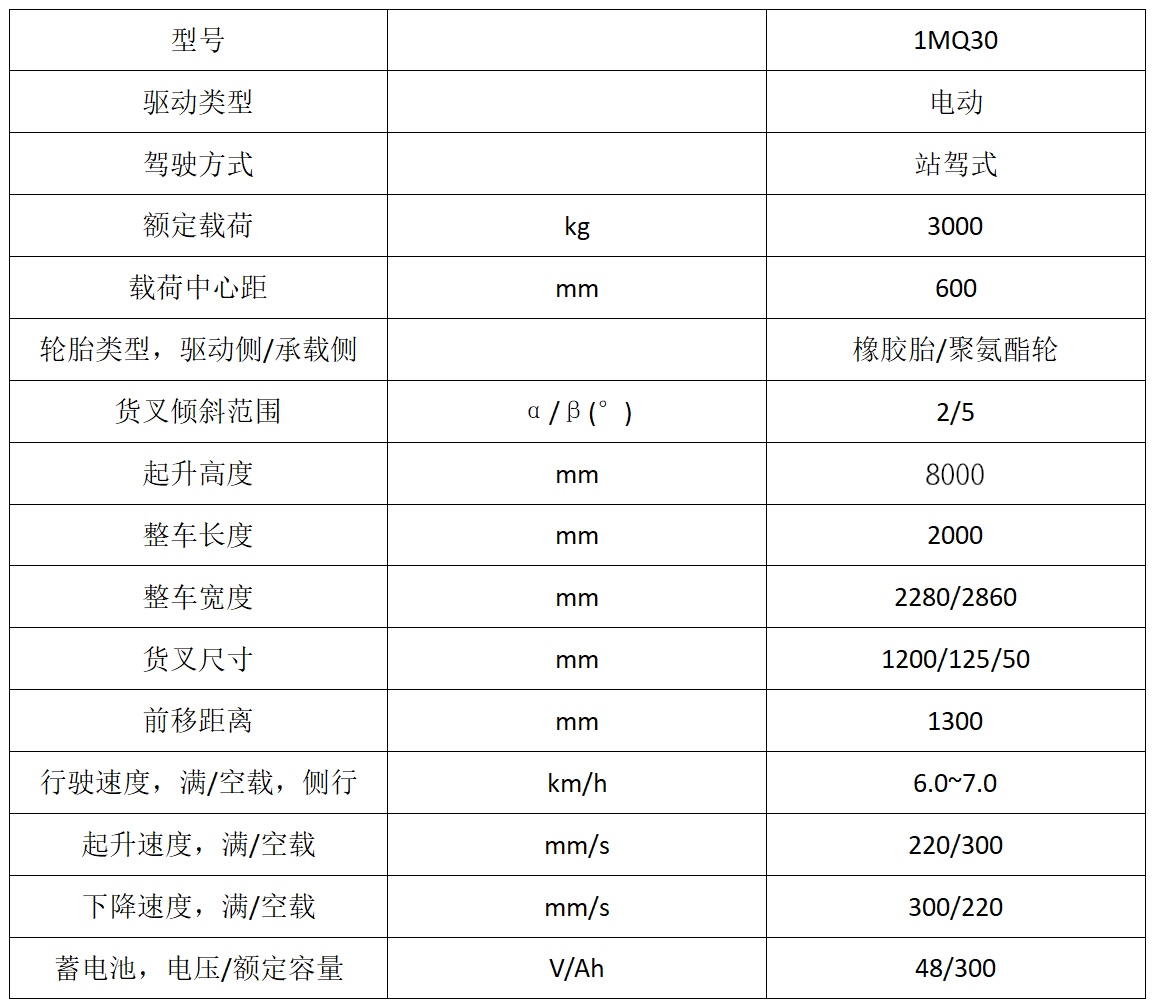 MQ30 全向前移式叉车,承载能力3.0吨,门架可以整体前 移或缩回,配置有加宽调距货叉,四轮转向独立控制,可 以直行、侧行、斜行、原地回转;侧行时拥有较小的通 道,特别适用于长物料的工况。