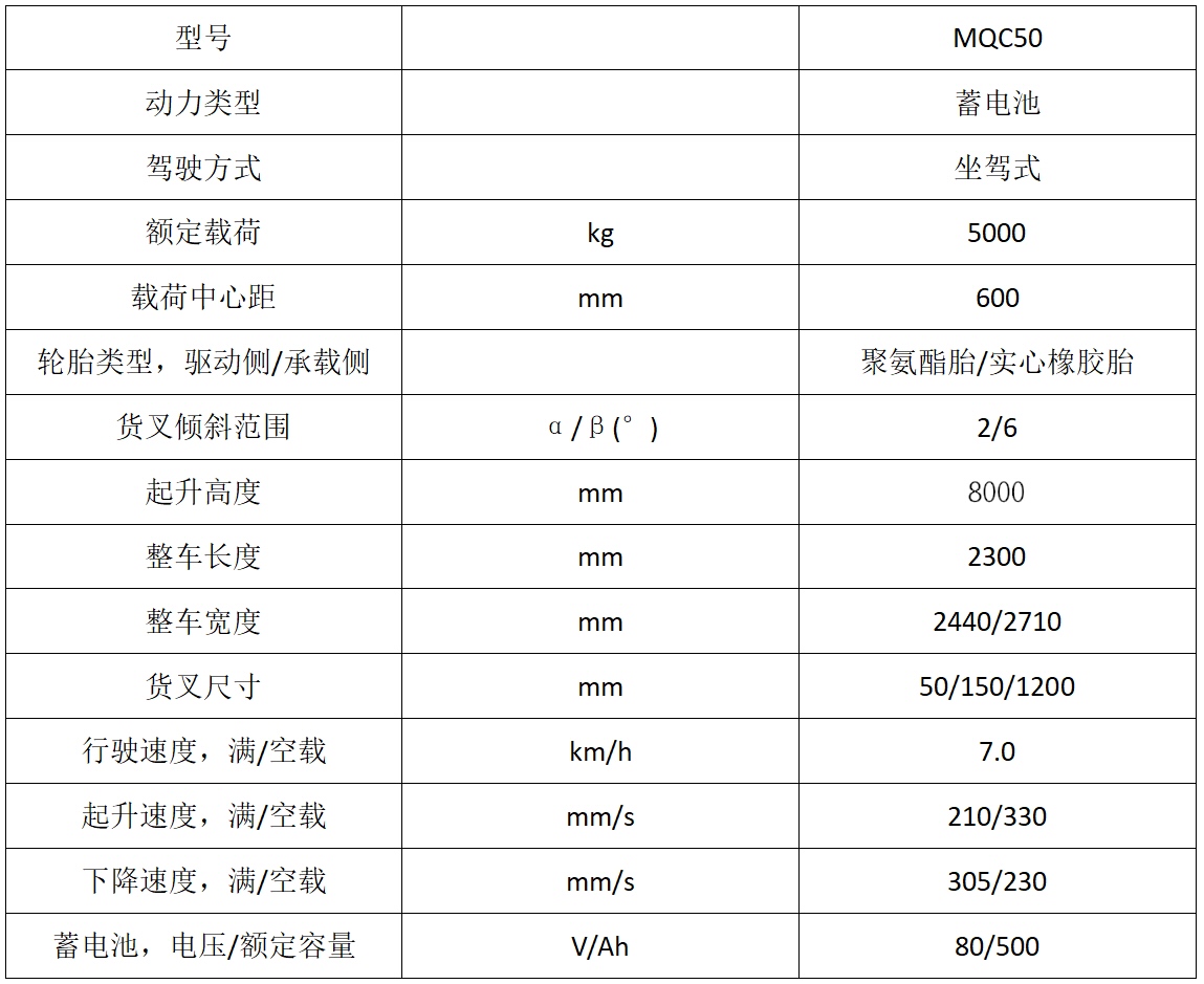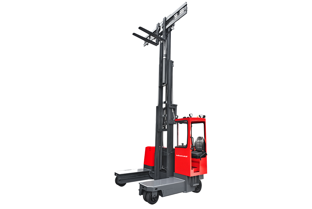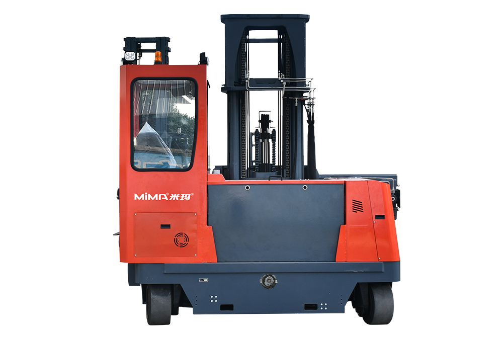 MQC50多向前移式叉车,承载能力5.0吨,门架可以整体前移或缩回,配置有加宽调距货叉,四轮转向独立控制,可以直行、侧行、斜行、原地回转;侧行时拥有较小的通道,特别适用于长物料的工况。