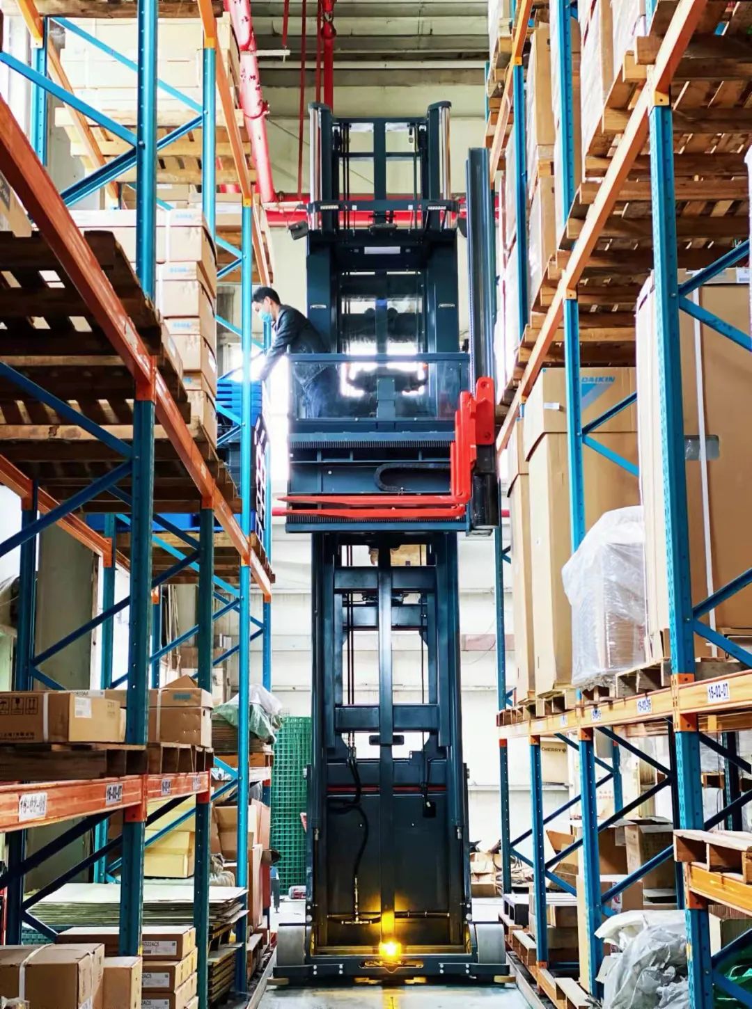4、MIMA人上型三向堆垛叉车驾驶员可随驾驶室同时起步上升,满足客户拣选货物的需求。
