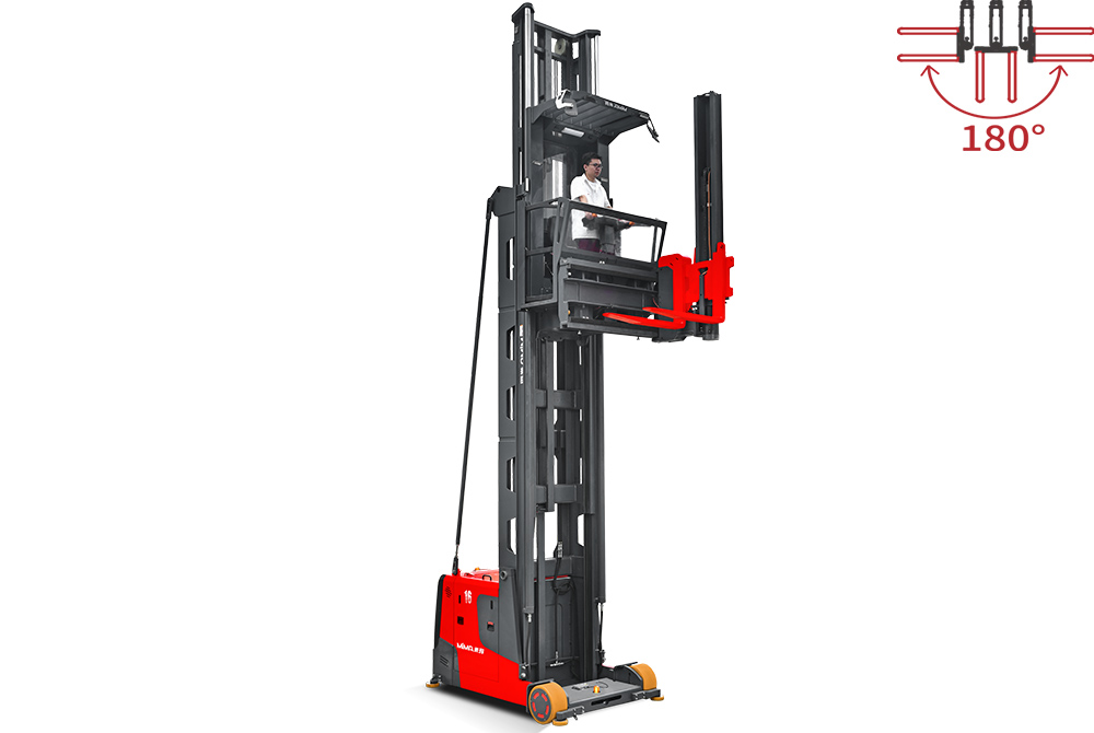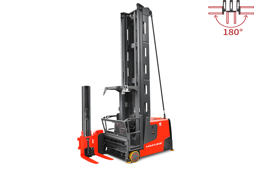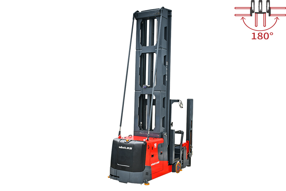 窄通道内车身无需转向,通过货叉180°旋转和左右侧移来实现巷道两侧的货物堆垛和装卸。